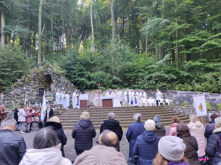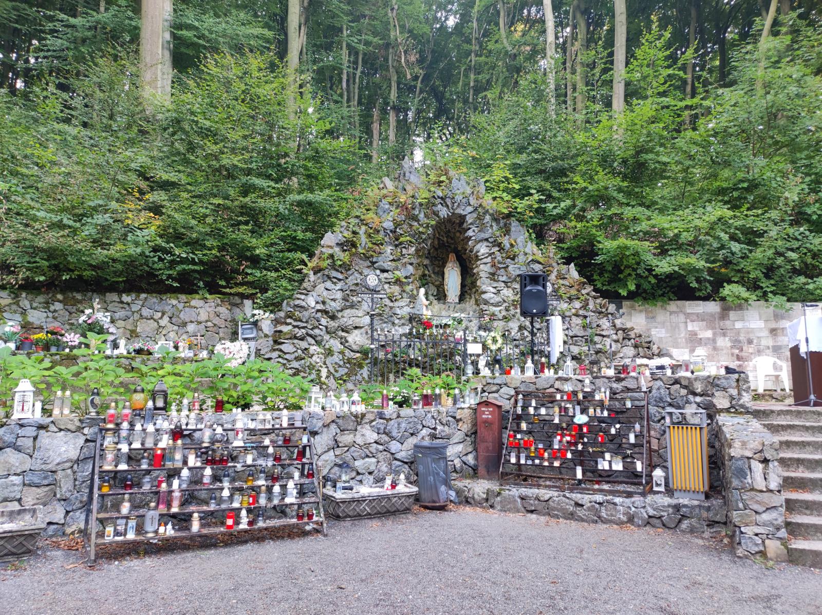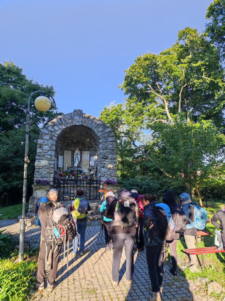 A gyalogos zarándokok is vállaltak egy tized elmondását a Lourdes-i barlang előtt.