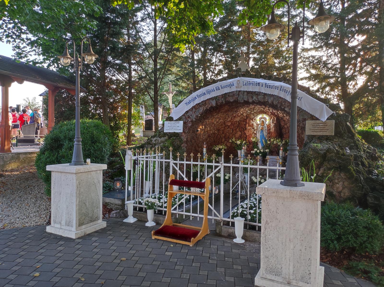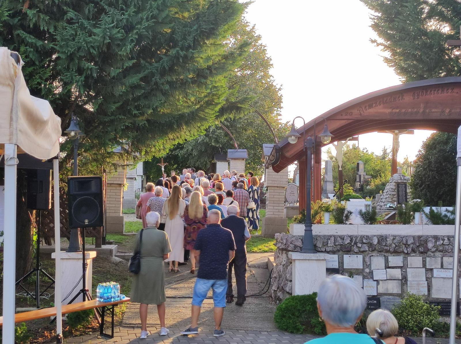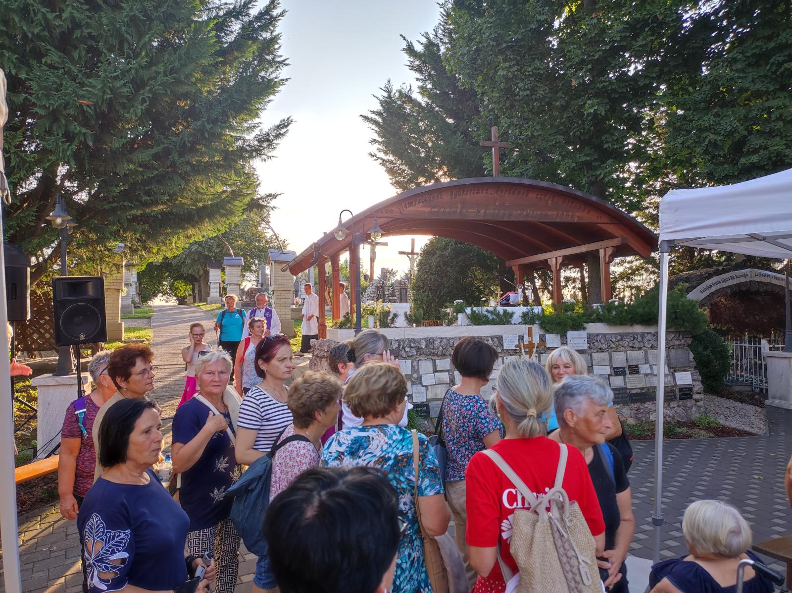 Kis pihenő után közösen elimádkozták az Isteni irgalmasság rózsafüzérét. Mária énekkel vonultak a temetőben található Lourdes-i barlanghoz. Itt a helyi hívekkel együtt, Puss Sándor jezsuita atya vezetésével elvégezték a keresztutat. A szentmise főcelebránsa és szónoka is Sándor atya volt, aki homíliájában utalt, hogy elvesznek az emberi értékek, újra kell teremteni az emberek közötti kapcsolatokat.