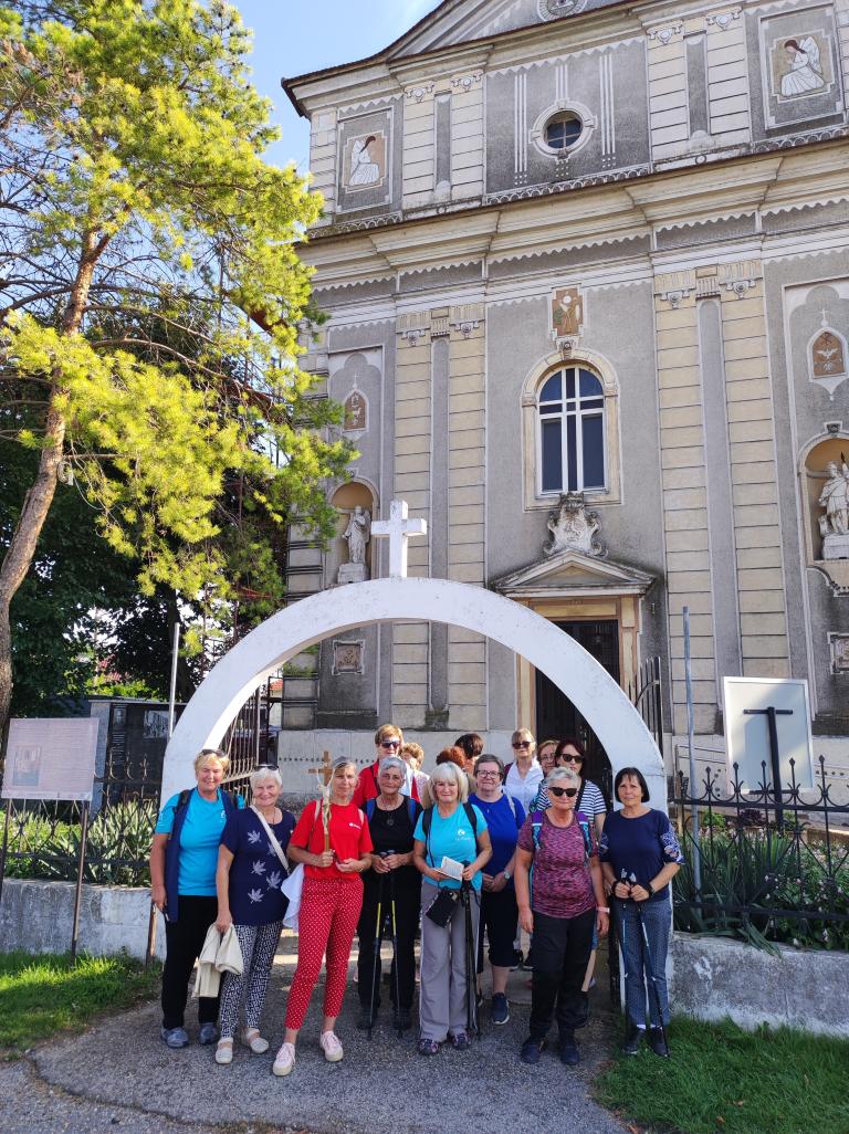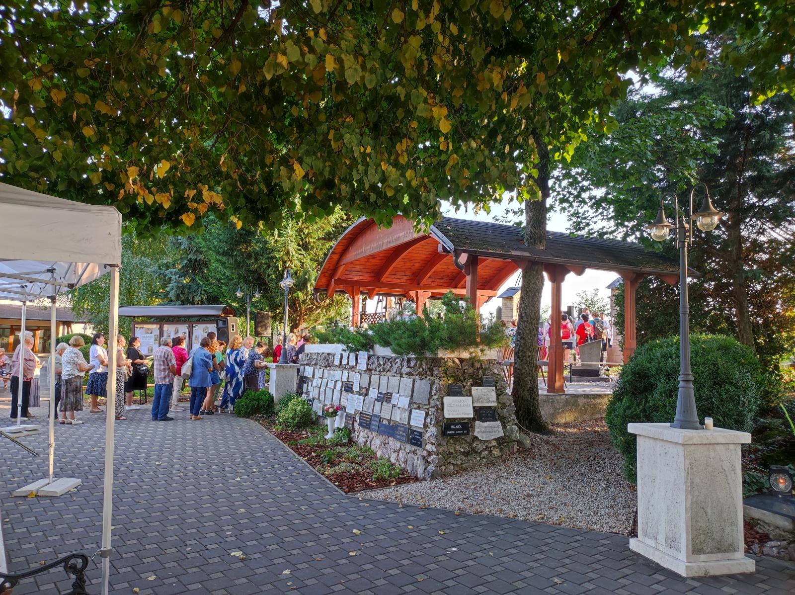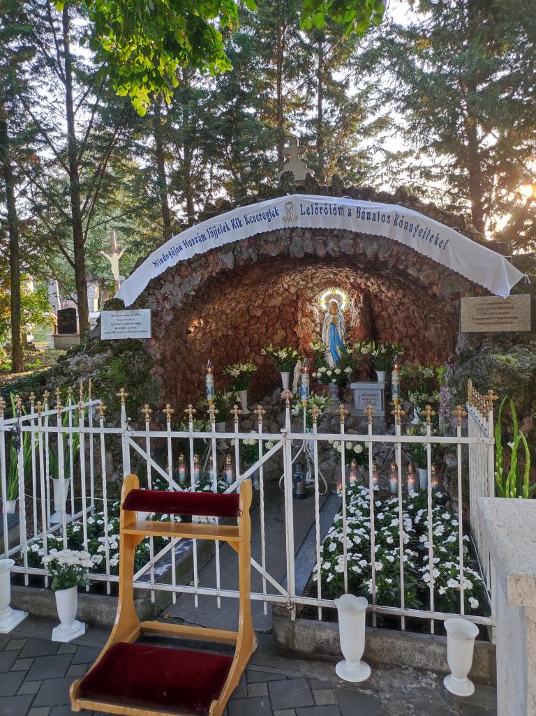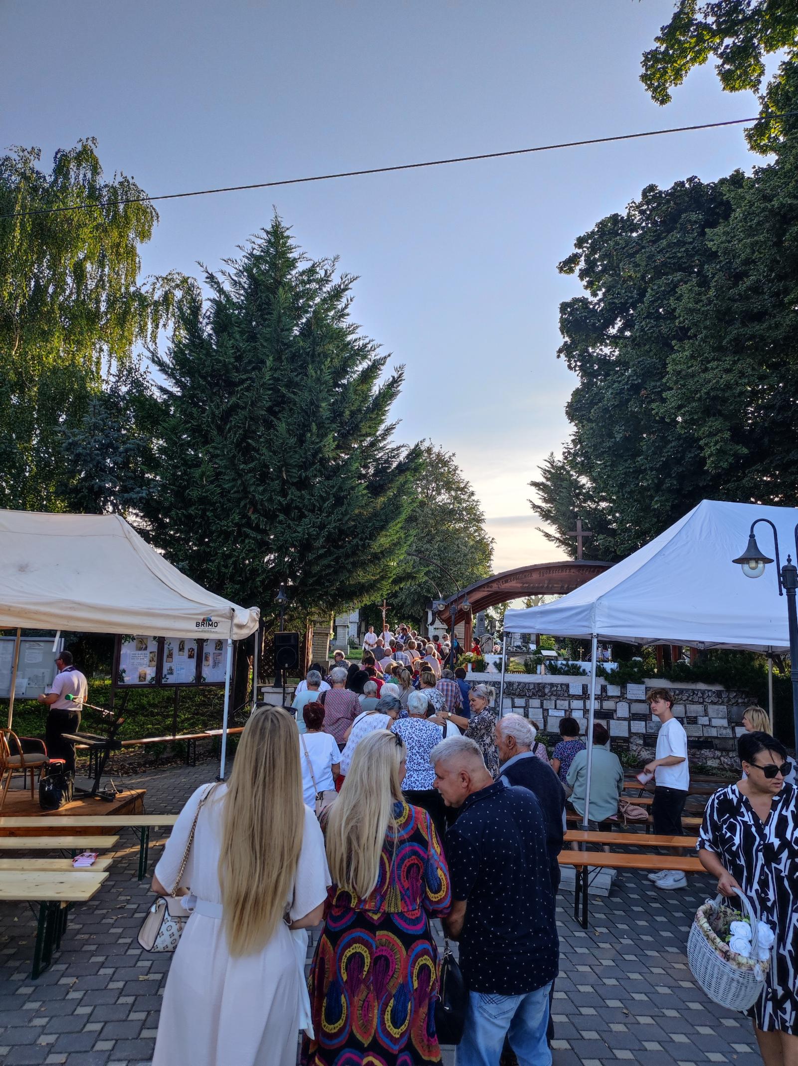 Kis pihenő után közösen elimádkozták az Isteni irgalmasság rózsafüzérét. Mária énekkel vonultak a temetőben található Lourdes-i barlanghoz. Itt a helyi hívekkel együtt, Puss Sándor jezsuita atya vezetésével elvégezték a keresztutat. A szentmise főcelebránsa és szónoka is Sándor atya volt, aki homíliájában utalt, hogy elvesznek az emberi értékek, újra kell teremteni az emberek közötti kapcsolatokat.