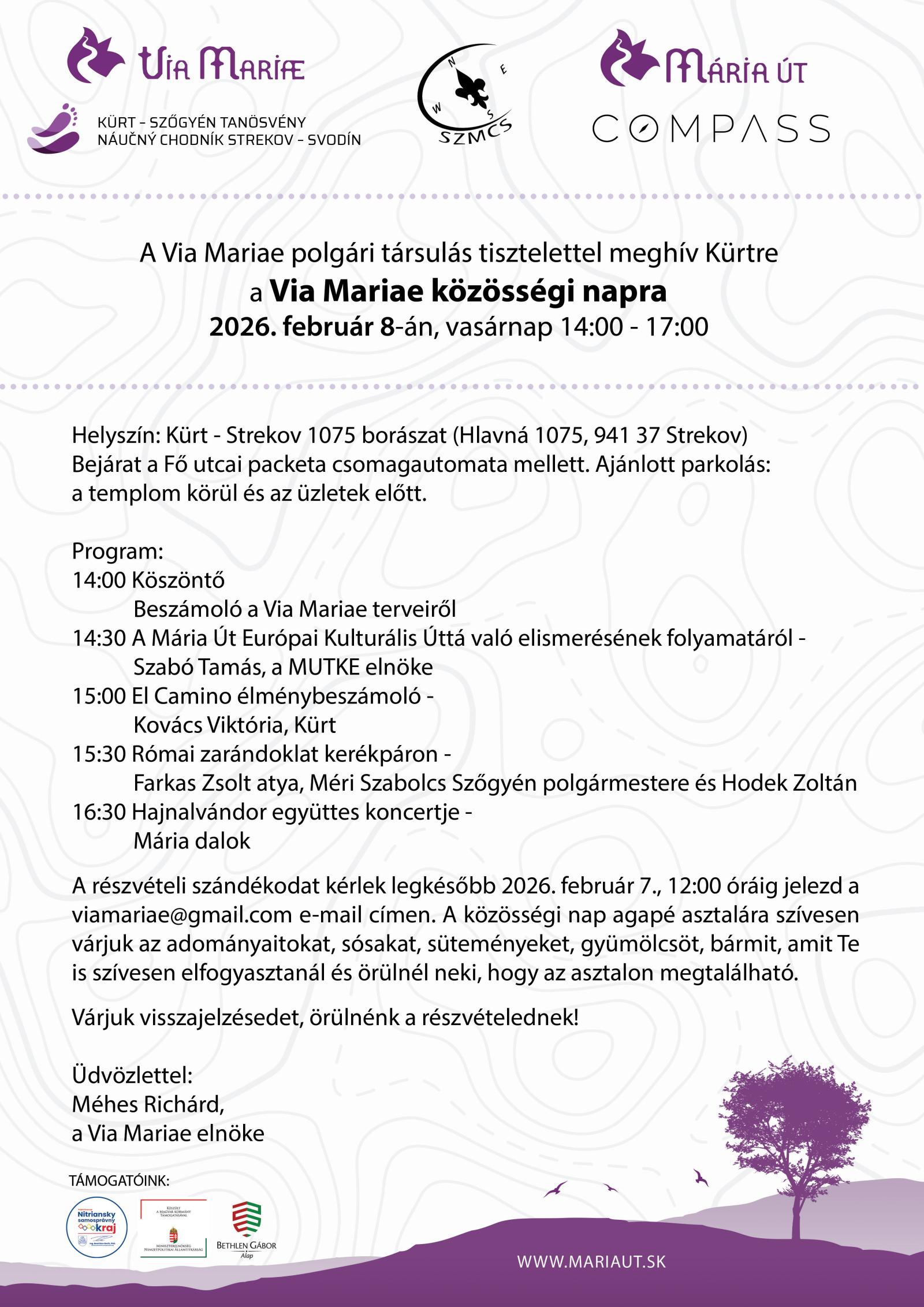 A Via Mariae polgári társulás tisztelettel meghív Kürtre a Via Mariae közösségi napra 2026. február 8-án (vasárnap).