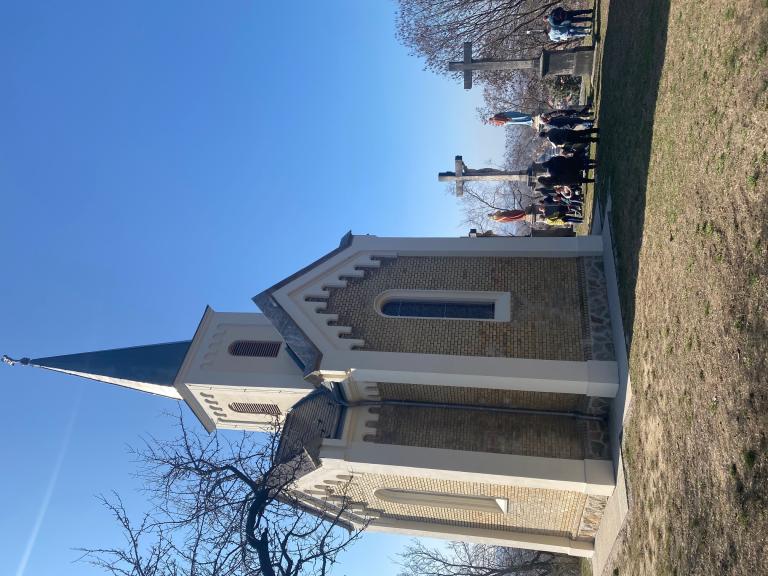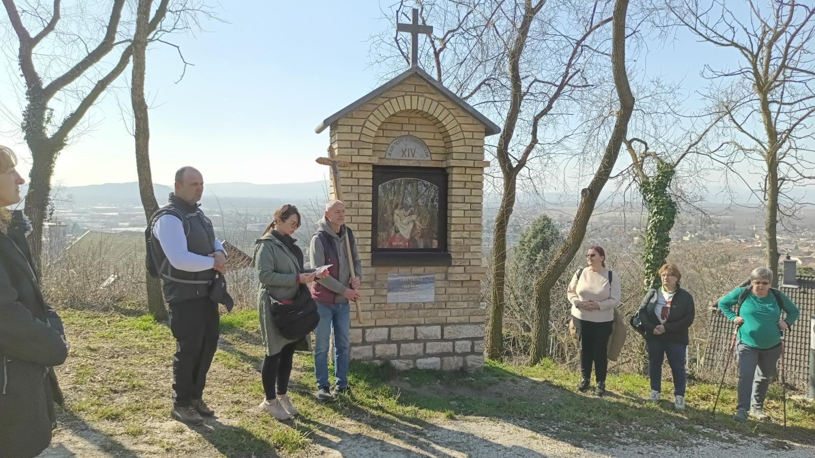 A végén az esztergom-belvárosi plébánia egyik aktív hívője kinyitotta nekünk a felújított Szent Kereszt-kápolnát (ez van a hegytetőn a kálvária felett).