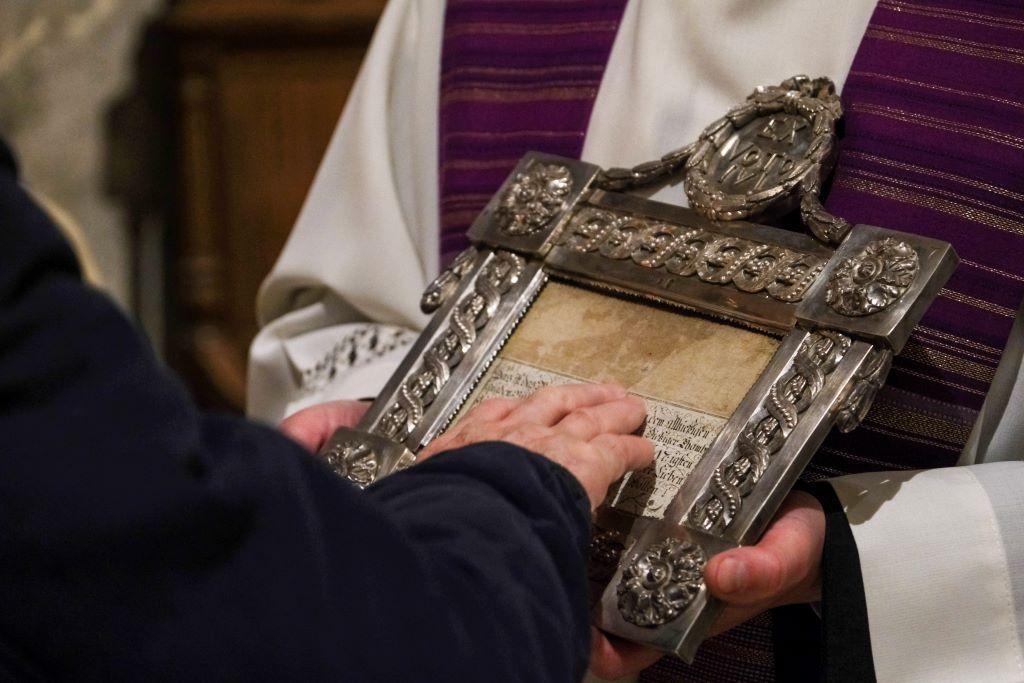 A főpásztori szentmisét követően a hívek kifejezhették tiszteletüket a Szűzanya véres könnyeit őrző ereklyetartó előtt.
