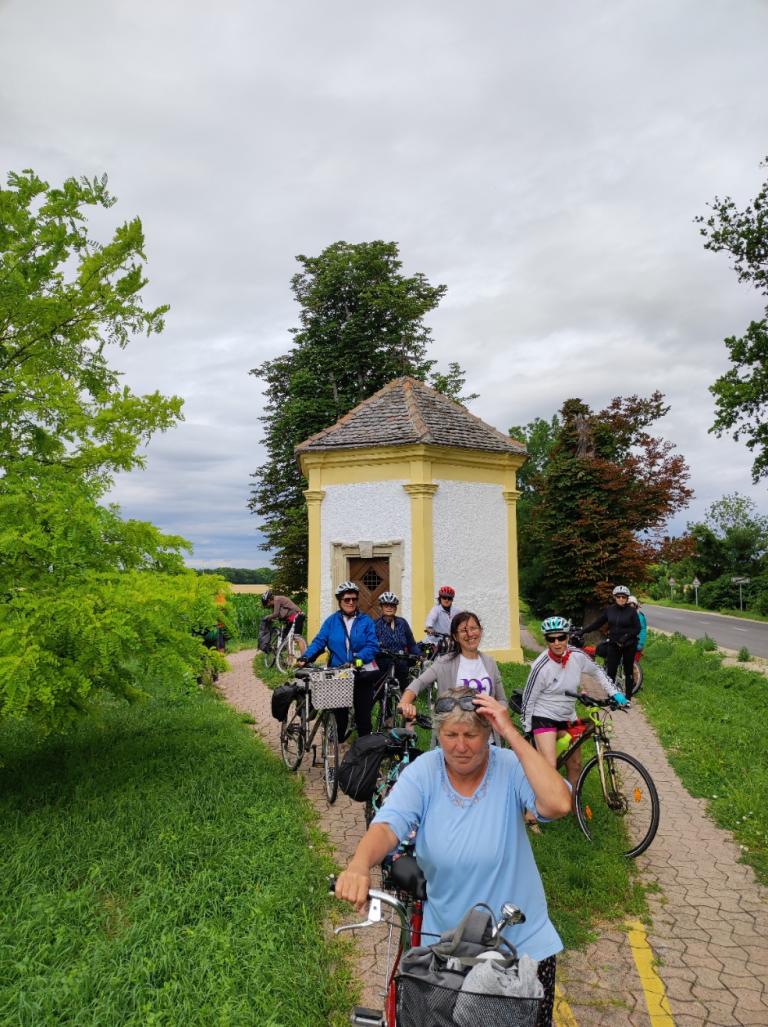 Itt egy kicsit mentek a forgalmas főúton, ami Mosonmagyaróvár felé visz. Majd az útról letérve egy földúton jutottak el a Háromtölgy-kápolnához, mely egy búcsújáróhely, a Hétfájdalmú Szűzanya kegyhelye. Búcsúk alkalmával a kegyhely körüli kis erdős rész megtelik. Szlovákok, horvátok, németek és magyarok zarándokolnak ide, volt mikor a felvidéki magyarok csoportja is megfordult itt a búcsún. A kápolna körül is szép, régi fák vannak. Jó volt itt megpihenni.