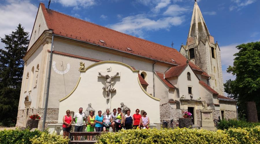 Míg pihentek, ettek-ittak, az egyik zarándoktárs fia odaérkezett biciklivel és elkísérte a zarándokcsoportot a zöldhatáron keresztül Rajkára. Ők Rajkán laknak. A Szent Márton-templomnál kicsit beszélt a helyi közösségekről és templomról. Sajnos a templom közelében álló szép, (télen is) jól mutató fákat kivágták, meghagyva a törzsük egy részét. Maga a templom tornya egy római őrtoronyból készült el.