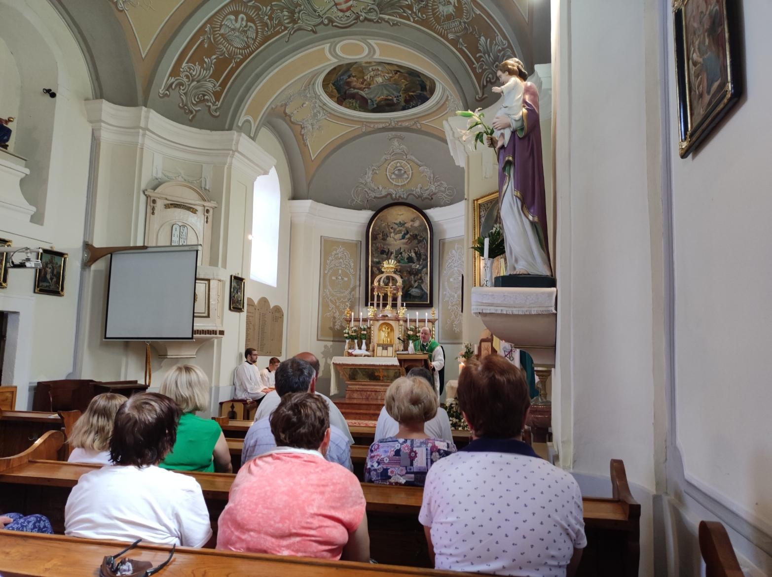 A mise előtt egy esküvő is volt és a mennyasszony révkomáromi volt. A Szűz Mária és Szent Gotthárd tiszteletére felszentelt templomban vettek részt szentmisén. Az atya az áldozásnál felfigyelt arra, hogy mi felvidéki csoportról van szó. Majd a mise végén kinyitotta a zarándokok számára a Szent Gotthárd kápolnát és szentképeket adott nekik a szentről. Kiderült, hogy ő is felvidéki születésű, de Magyarországra jött papneveldébe, majd pedig itt maradt.